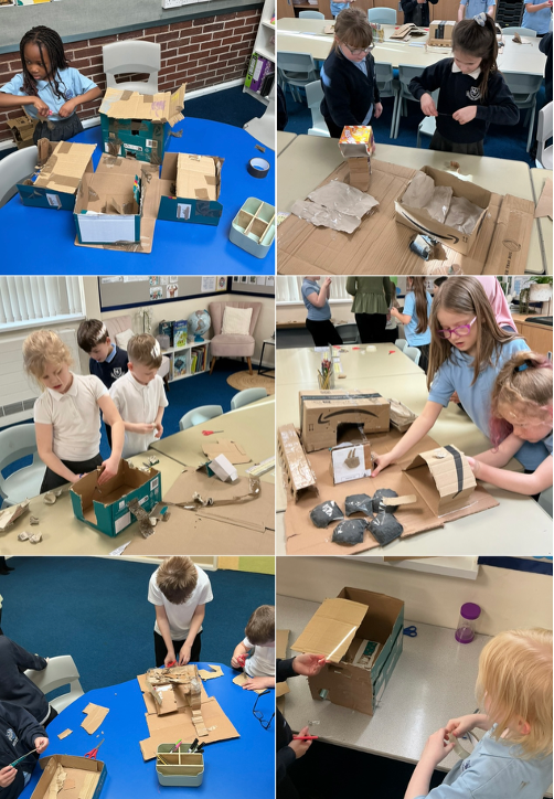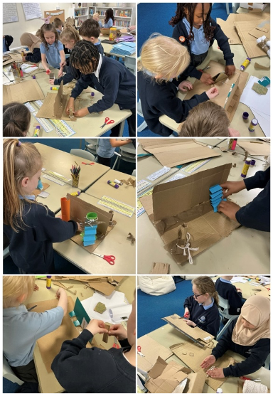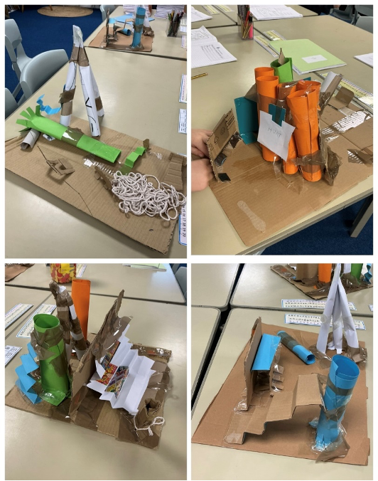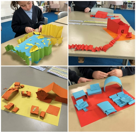 Working in small groups, the children planned and built large scale 3D sculptures using cardboard, card and paper. They experimented with folding, rolling, slotting and tabs. They used different joining materials while problem solving when ideas did not work first time, showing resilience and independence in their learning.