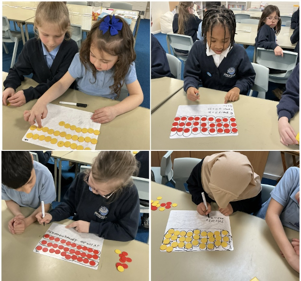 Using concrete materials, the children created arrays using counters to support their understanding of how multiplication facts can be combined. By visually adding groups together, the children were able to see how more difficult multiplication calculations could be worked out more easily. This practical approach helped build confidence and supported the children in remembering new multiplication facts for the 3 times table.