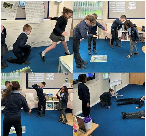 Today in English, we have been exploring the illustrations in the book Rhythm of the Rain by Grahame Baker-Smith through drama and role play. The children worked in groups to bring the settings to life by moving through them, making sounds, and imagining what they could see, hear and feel. They practised speaking in a narrator’s voice and used rich descriptive language, including expanded noun phrases, adverbs, and personification, describing the river, trees, and forest as if they were alive. This helped the children clearly verbalise and develop their ideas, ready for writing their own direct narratives in the next lesson.