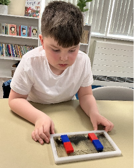 Today, the children explored magnets by using bar magnets and iron filings to make magnetic fields visible. They were excited to see the iron filings form patterns around the magnets, helping them understand how magnetic forces work. The class observed that the filings were most concentrated at the ends of the magnets and correctly identified these as the poles, where the magnetic force is strongest.