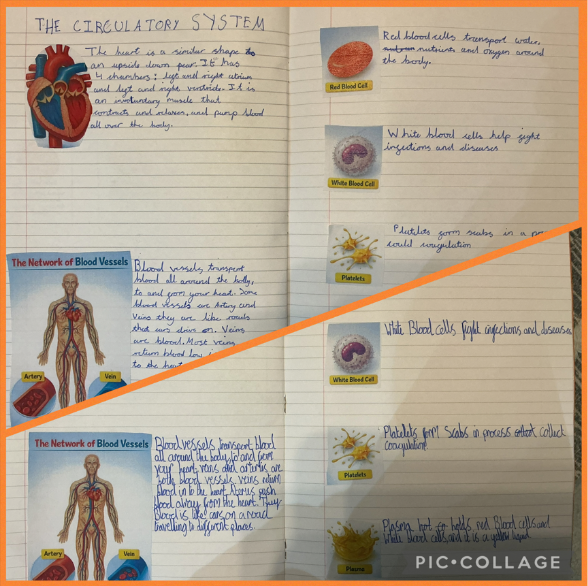 The blood vessels were our focus in science this week. We learnt that veins mainly carry deoxygenated blood back to the heart and that arteries carry oxygenated blood away from the heart. The blood vessels are almost like roads, and the blood is like vehicles delivering essential items to the body. We then produced fact files all about the circulatory system: heart, components of blood and blood vessels.