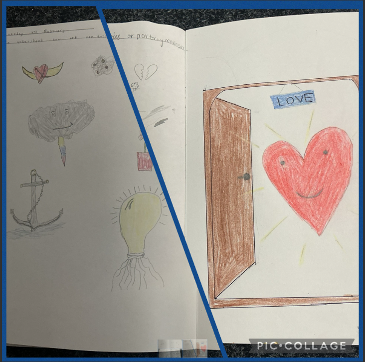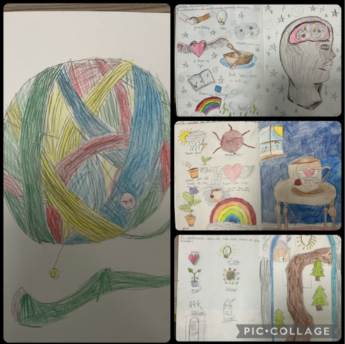 In art, we looked at the piece ‘Five’ produced by Lubaina Himid. Lubaina created artwork that contained symbols and told a story about real-life issues. We used this as inspiration to create our own piece of artwork linked to ‘Children’s Mental Health Week’. You would see symbols like an anchor representing stability; a bridge that represents connecting with people and a plant to represent personal growth.