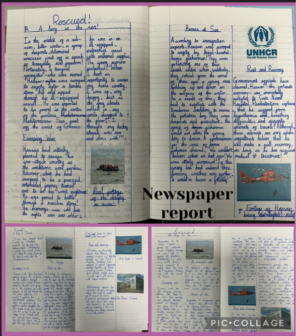 In English, we have started to write our newspaper reports all about the rescue of a refugee from the Mediterranean Sea, just off the coast of Greece. This has been based on our focus text of ‘A Story Like the Wind’. The children have made a fantastic start to this piece of work and have made a real effort to include the skills taught during the gathering content phase of our writing: applying a formal tone, using semi-colons, hyphens and the use of informal language when a witness provides a quote.