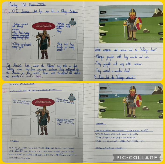 During our history lesson this week, we have been learning about Viking life. Using the chromebooks for research, the children found out more about the weapons and armour that soldiers wore and how they carried out attacks. The children discovered that many Viking attacks involved the element of surprise and fought with very little armour. They also inferred what the Vikings were like based on the eyewitness account from St Alcuin. His writing suggests that they were merciless as they destroyed the house of the saints.