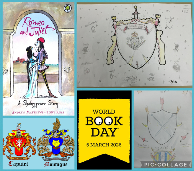 On Thursday, we celebrated World Book Day. We started the day with an assembly with Ms Blackledge in which the children took part in a parade to showcase their costumes. In the afternoon, we then did some work around the book we recently read as a class – Romeo and Juliet. The children picked either Romeo or Juliet and designed a shield to represent their family. Surrounding the shield, was vocabulary, accompanied with symbols, that described our chosen character.