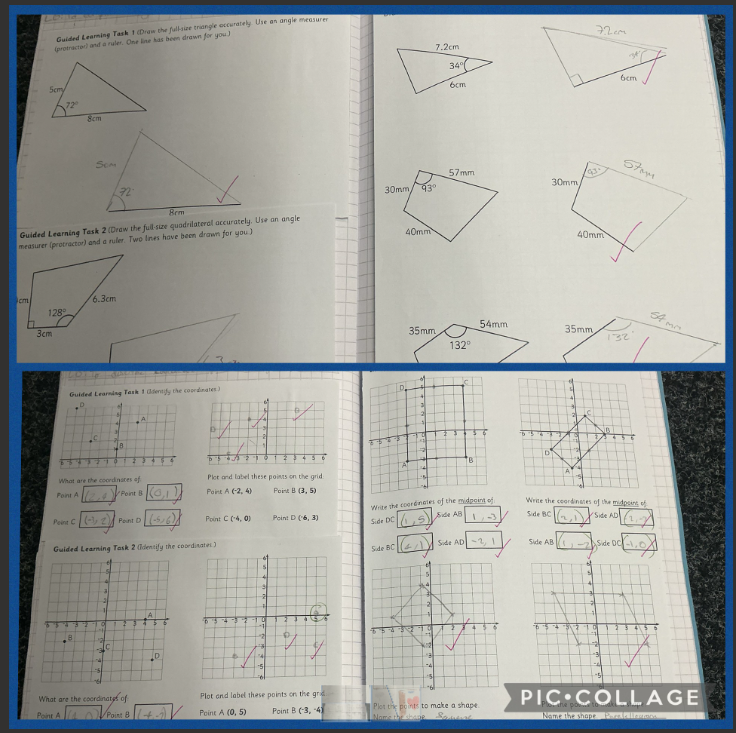 In mathematics, we completed our work on angles by calculating missing angles in triangles and learning how to draw shapes using a protractor when we are provided with certain measurements. We ended the week by moving onto coordinates and spoke about moving along the x axis and then up or down the y axis.