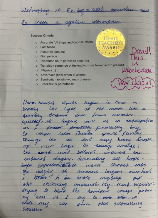 In our English lessons this week, we planned and started to write our very own flashback narrative based on the text, ‘A Story Like the Wind’. The children have used the ideas generated during the planning phase to make a fantastic start to their narrative. You can see a fantastic example below: