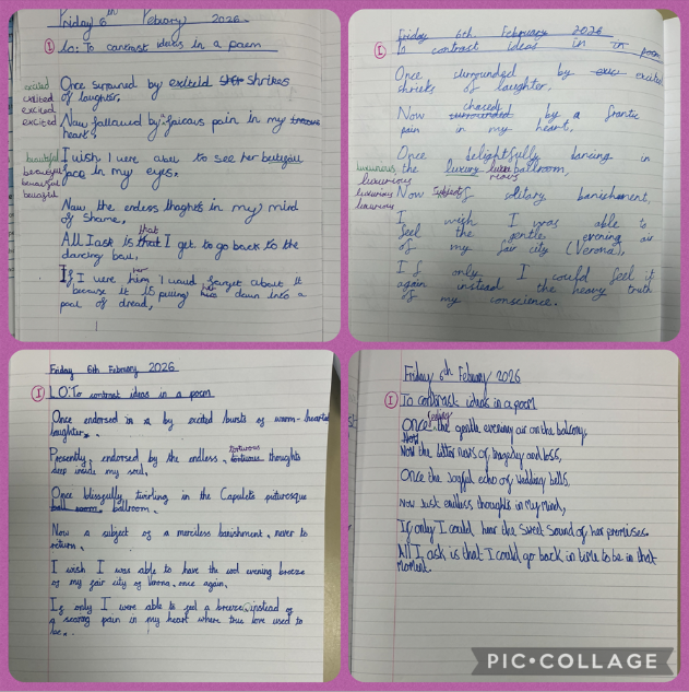 This week in English, we have started our unit on Shakespeare’s Romeo and Juliet. The children started the week by listening to the story and generating words and phrases that could be used to describe Romeo. The children produced words such as intrepid, love-struck and determined. Following on from this, they produced a poem detailing the good times of Romeo and Juliet’s relationship and the present troubles.