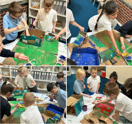 Working in small groups, the children planned and built large scale 3D sculptures using cardboard, card and paper. They experimented with folding, rolling, slotting and tabs. They used different joining materials while problem solving when ideas did not work first time, showing resilience and independence in their learning.